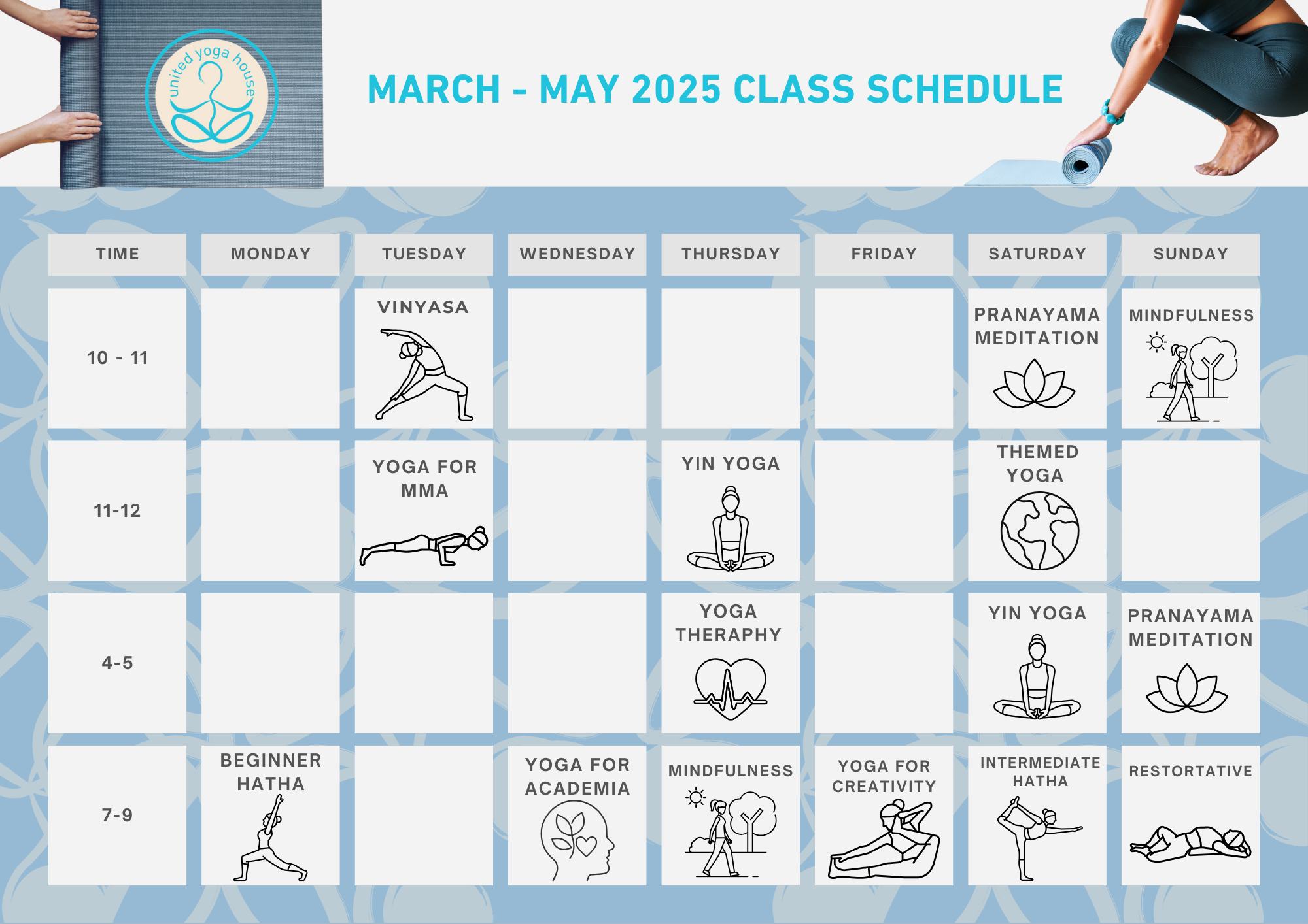 At United Yoga House, we offer yoga classes tailored to different levels and needs. Our sessions include Hatha, Vinyasa, Yin, and Restorative Yoga, as well as Pranayama & Meditation and Mindfulness & Stress Management, all designed to enhance mental and physical balance.