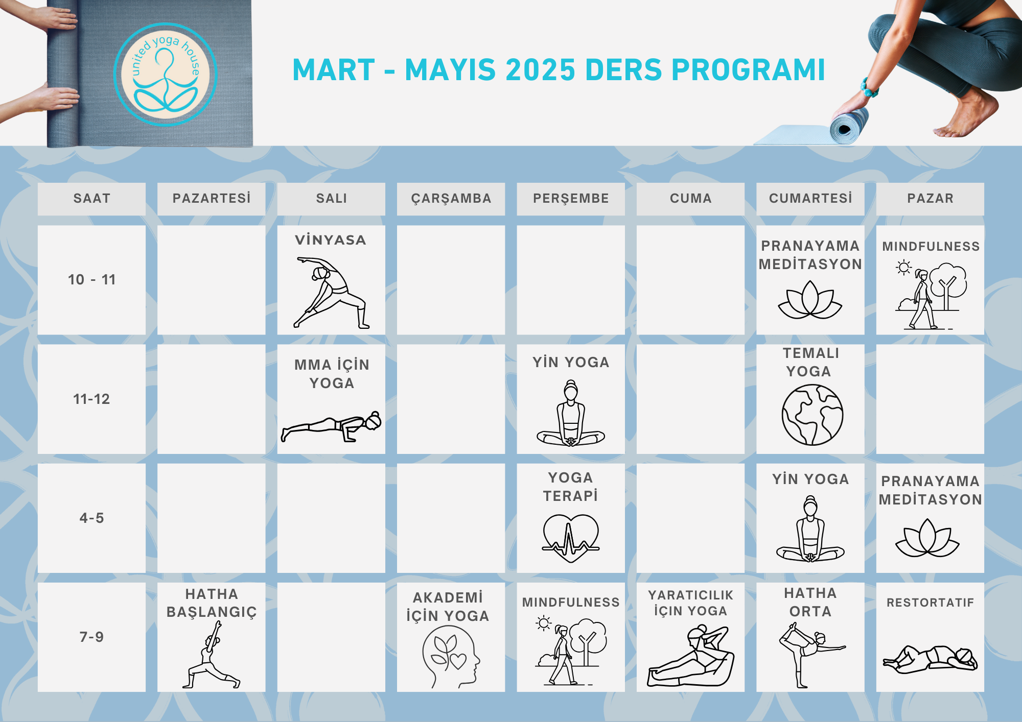 United Yoga House’ta farklı seviyelere ve ihtiyaçlara yönelik yoga dersleri sunulmaktadır. Hatha, Vinyasa, Yin, Restoratif Yoga gibi pratiklerin yanı sıra Pranayama & Meditasyon ve Farkındalık & Stres Yönetimi dersleriyle zihinsel ve fiziksel dengeyi geliştirmeye odaklanıyoruz.